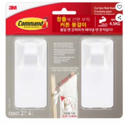 Command 3M 화이트 커튼봉 훅 80개 세트는 손쉽게 설치할 수 있는 실용적인 제품입니다. 강력한 접착력으로 벽이나 창틀을 손상 없이 고정할 수 있으며, 깔끔한 화이트 컬러 디자인으로 어떤 인테리어에도 자연스럽게 어울립니다. 다량 구성으로 여러 개의 커튼봉을 한 번에 설치할 수 있어 가정, 사무실, 상업 공간 등 다양한 환경에서 활용 가능합니다.